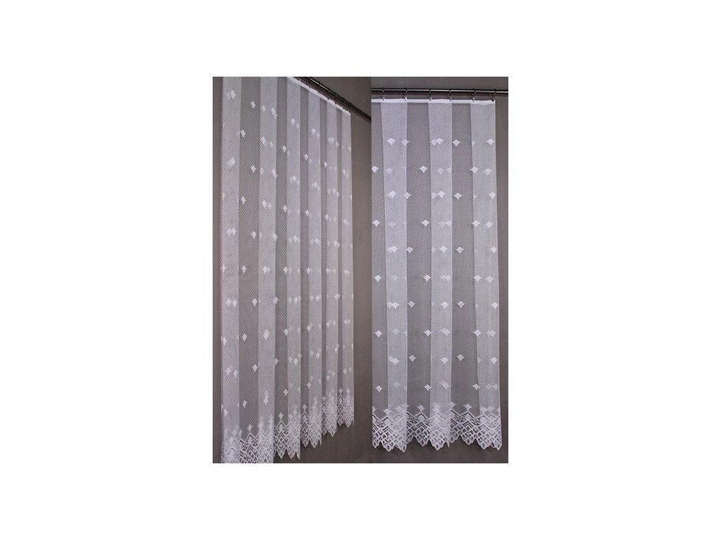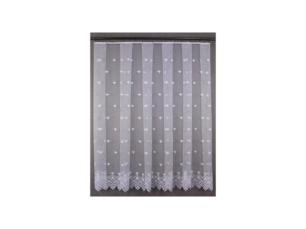 Hrubě pletená žakárová záclona s výrazným vzorem a ve spodní části bohatě zdobenou bordurou, zakončenou do špiček Nahoře má tato záclona pevný okraj pro uchycení na žabky. Materiál 100% polyester.