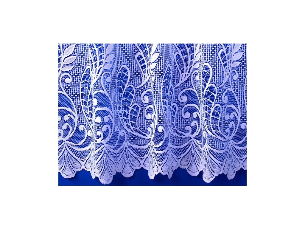 Bílá žakárová záclona s zajímavým vzorem a zajímavým zakončením v dolní částí , Materiál: 100 % polyester .Prat na 40°C, neždímat .Cenu uvedeno za 1 běžný metr.
