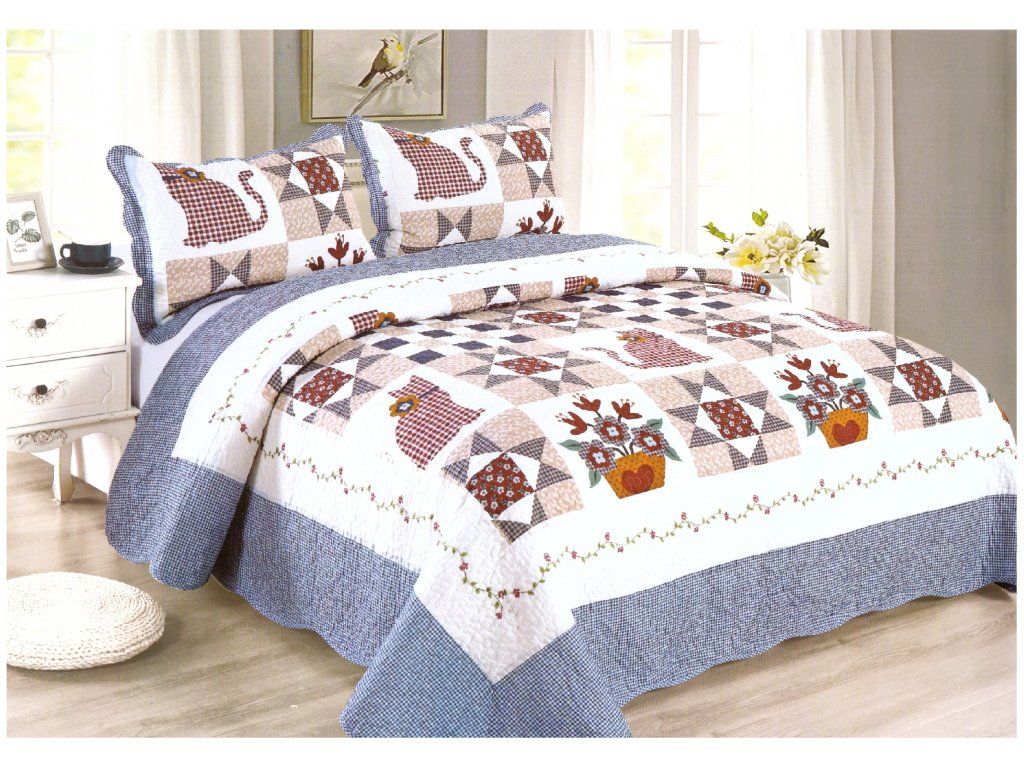 Přehoz na postel - dvoulůžko je praktický a moderní přehoz přes postel, zútulní váš interiér a zpříjemní vaše bydlení. Přehoz vždy je oboustranný. V detajléch jsou vyfocené obě strany přehozu Povlaky jsou součástí balení. Rozměr na přehoz 230 x 250cm a 2 x 50x70cm dva povlaky na polštář Složení: 100% bavlna praní na 30°C Přehozy vhodné přes postele, na lůžka i na sedací soupravy.
