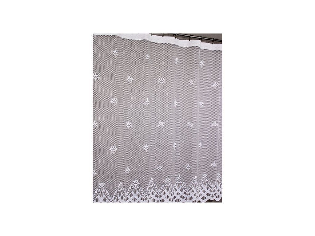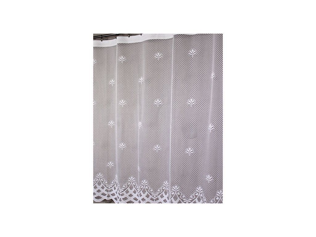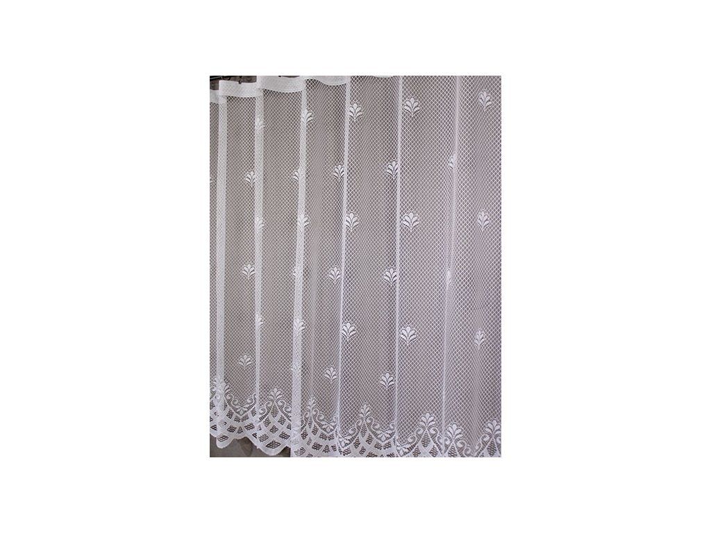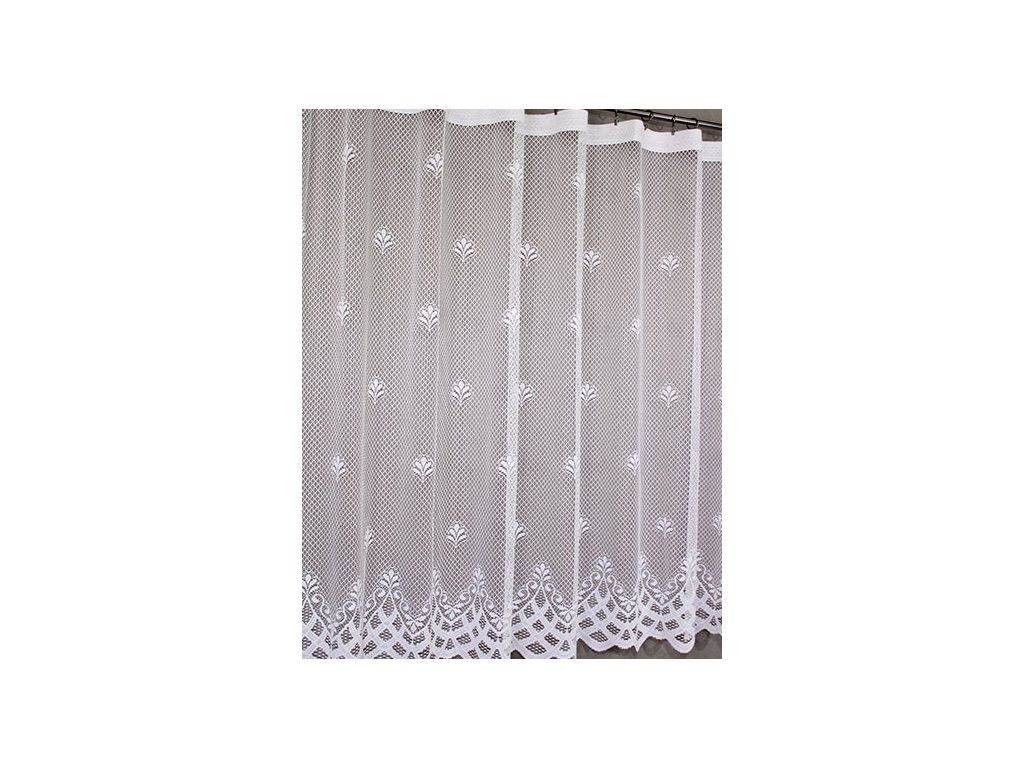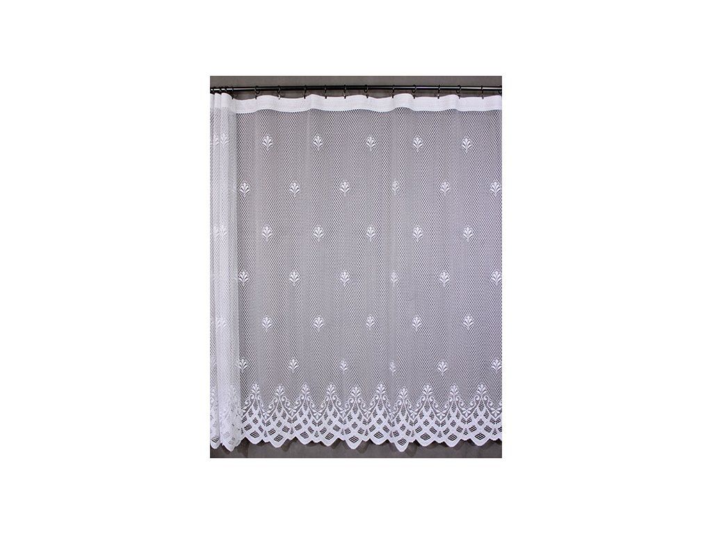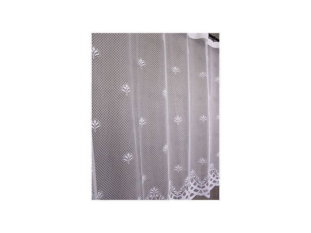 Kvalitní, žakárová, pletená, polyesterová záclona s výrazným vzorem a ve spodní části bohatě zdobenou bordurou, zakončenou do obloučků. Je vyrobena ze 100% polyesterových vláken. Nahoře má tato záclona pevný kraj pro uchycení na žabky. Vyznačuje se velmi vysokou kvalitou.