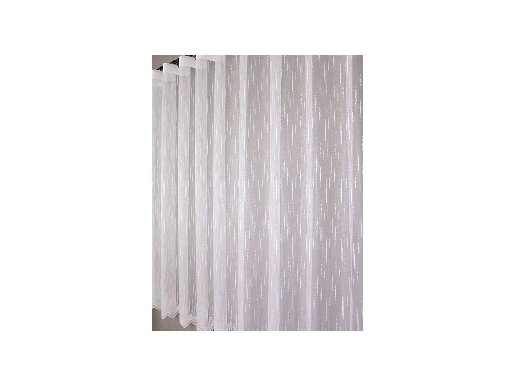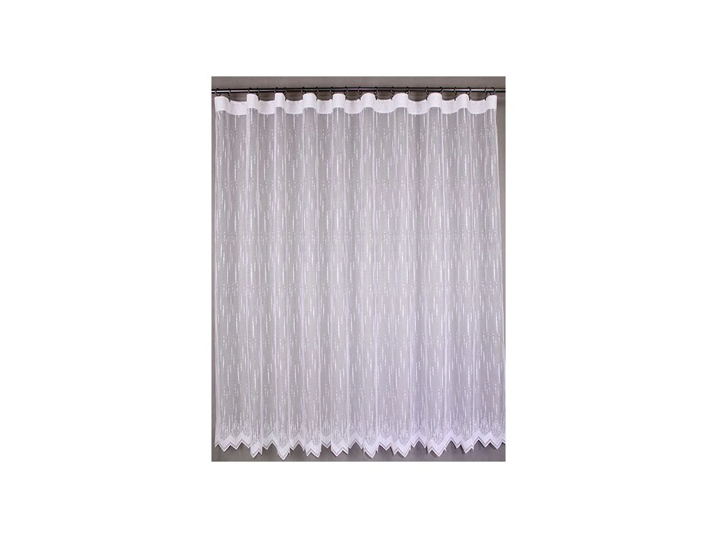 Kvalitní, žakárová, polyesterová záclona s decentnim vzorem a ve spodní části zakončenou do špiček. Je vyrobena ze 100% polyesterových vláken. Nahoře má tato záclona pevný kraj pro uchycení na žabky. Vyznačuje se velmi vysokou kvalitou.