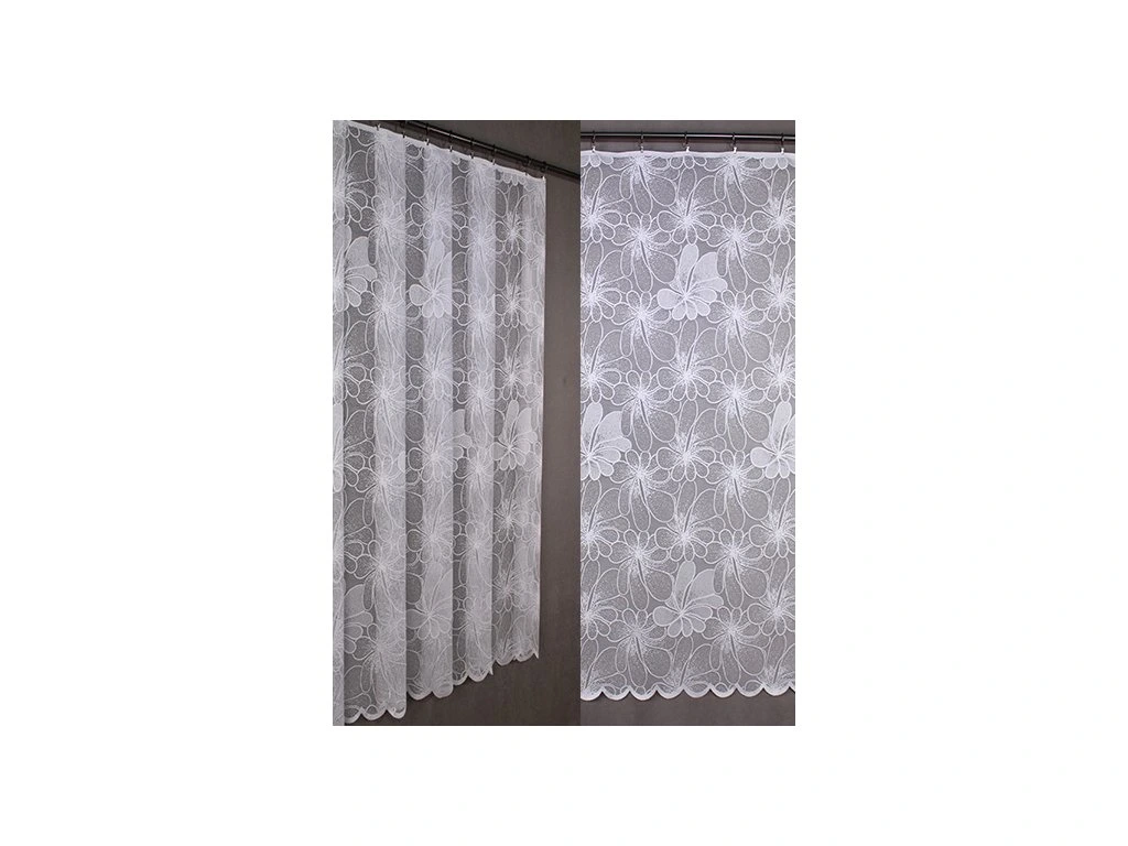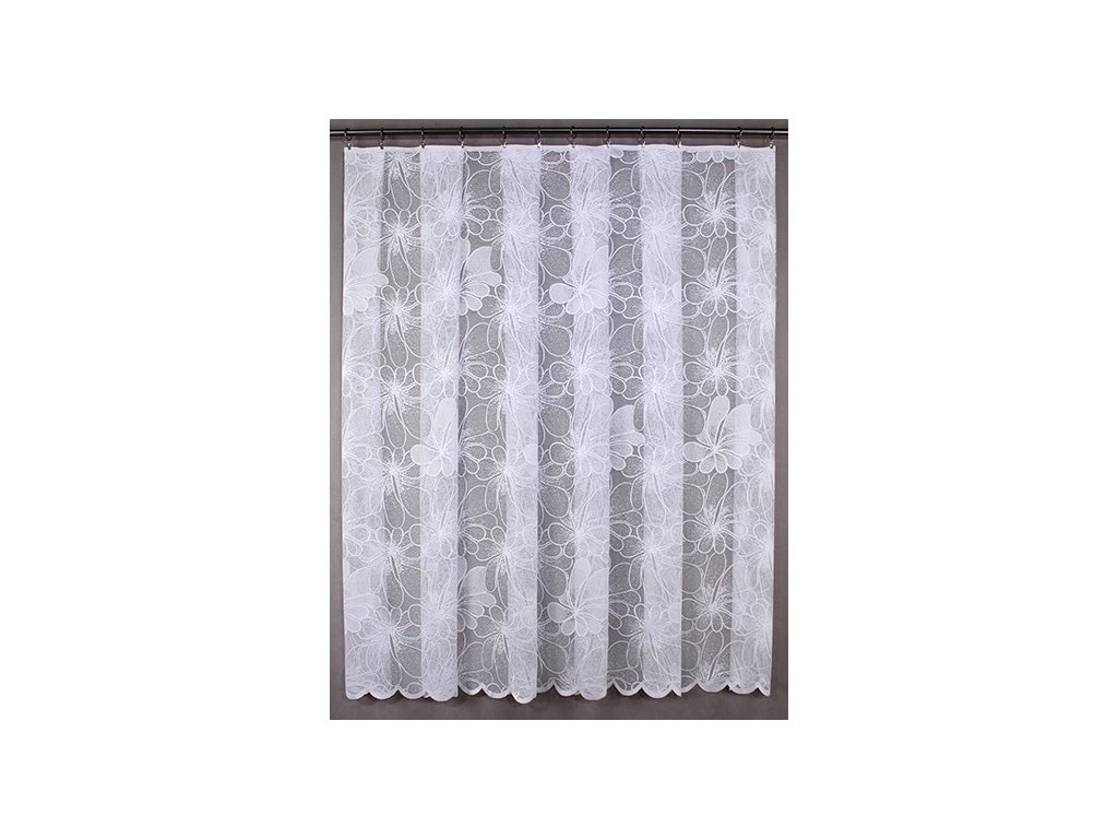 Pletená žakárová záclona s výrazným vzorem. Nahoře má tato záclona pevný okraj pro uchycení na žabky. Materiál 100% polyester.