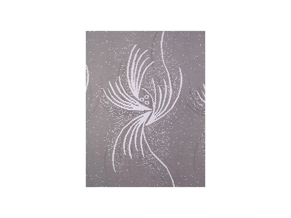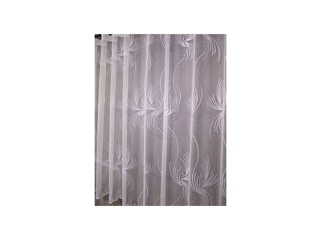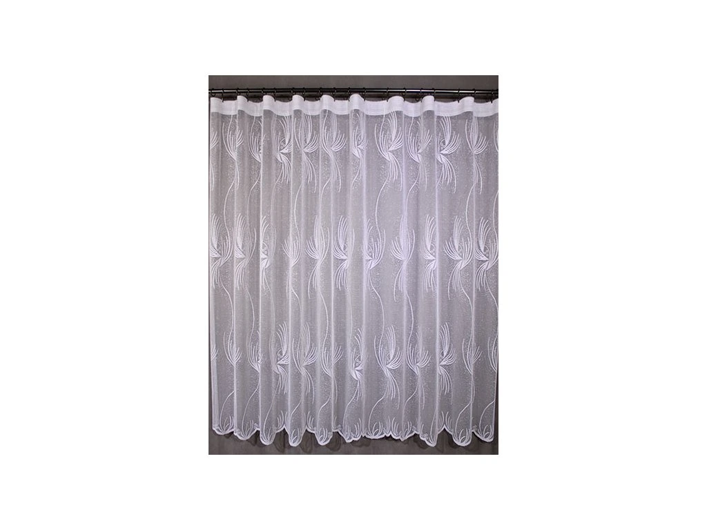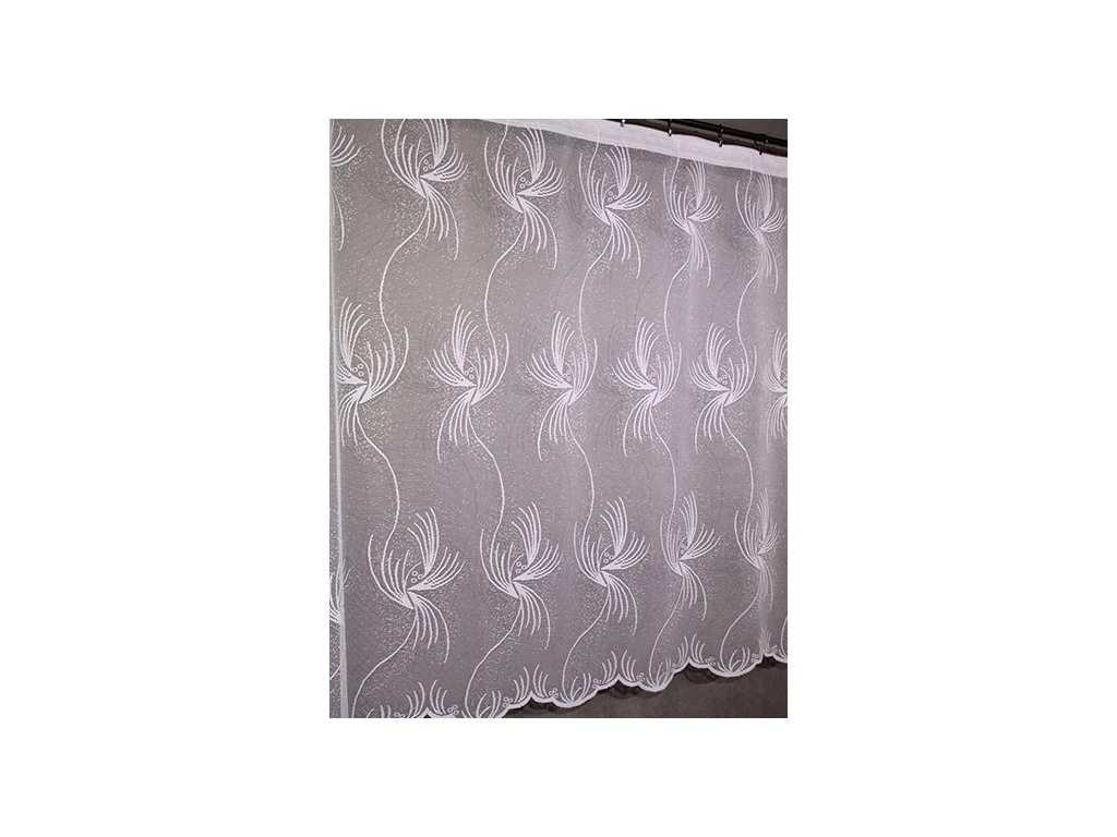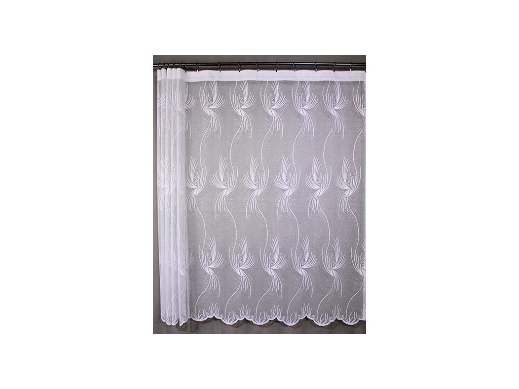 Kvalitní, žakárová, pletená, polyesterová záclona s výrazným vzorem. Spodní lem je zakončen menším vlněním. Je vyrobena ze 100% polyesterových vláken. Nahoře má tato záclona pevný kraj pro uchycení na žabky. Vyznačuje se velmi vysokou kvalitou.