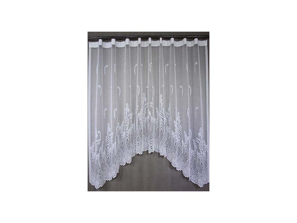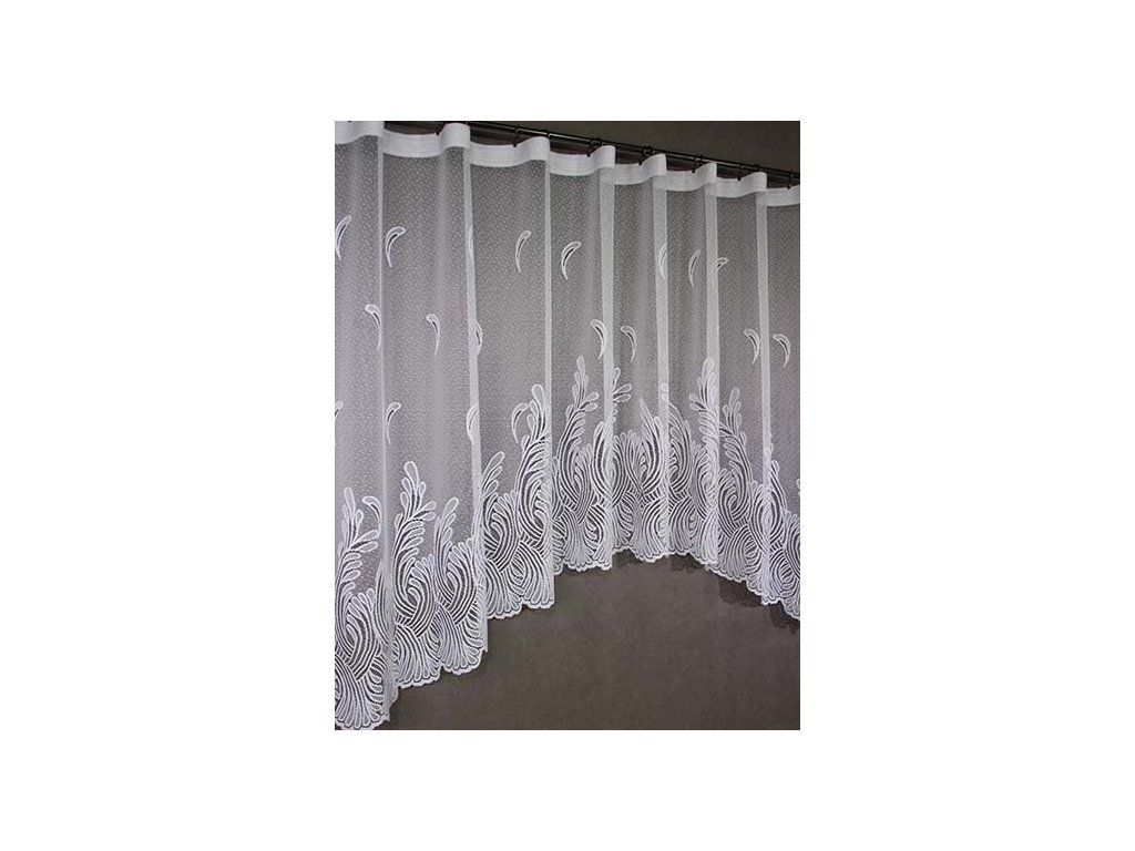 Oblouková záclona v bílé barvě s drobnými vzory krásné propouští světlo. Hodí se do každého interiéru.