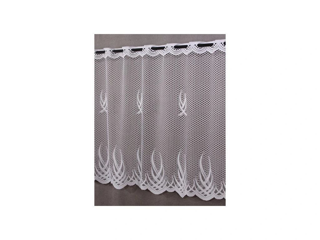 Hrubě pletená žakárová vitrážková záclona s výrazným vzorem a ve spodní části bohatě zdobenou bordurou.