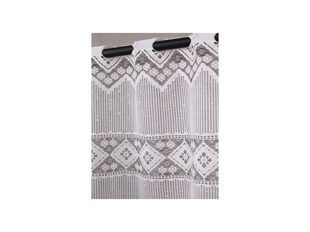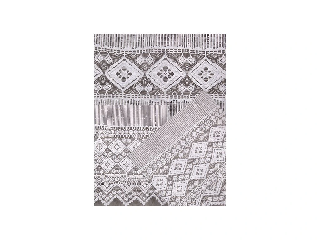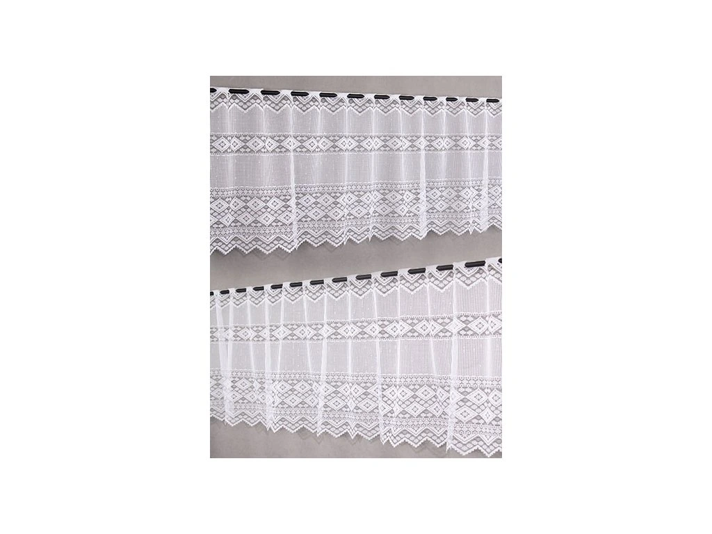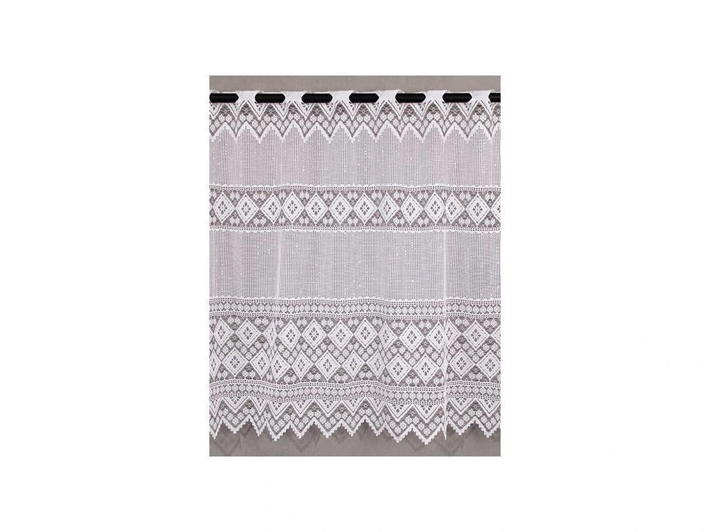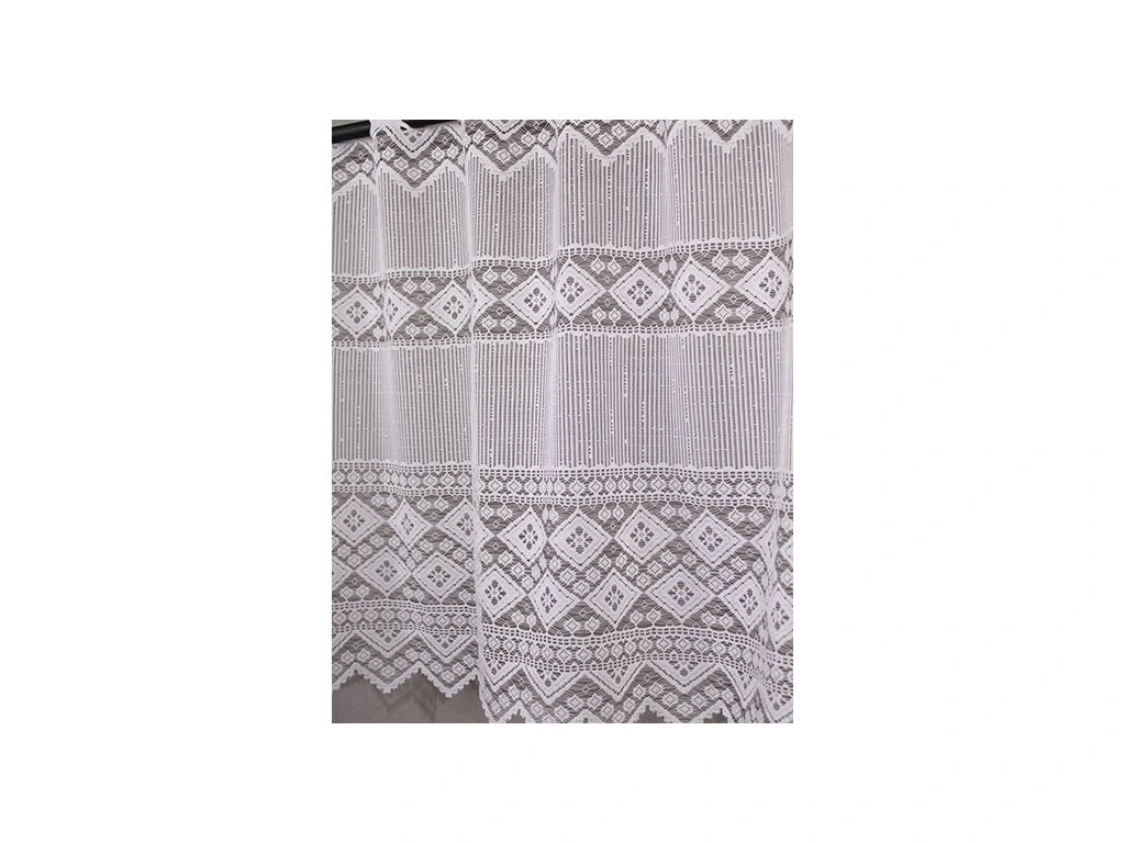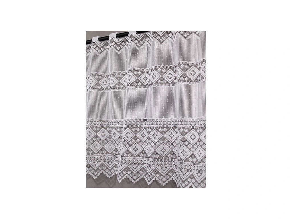 Hrubě pletená žakárová vitrážková záclona s výrazným vzorem a ve spodní části bohatě zdobenou bordurou, zakončenou do špiček.
