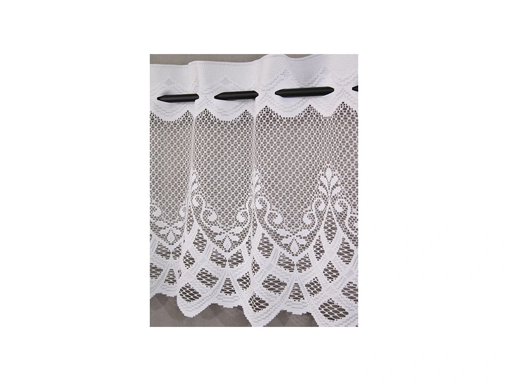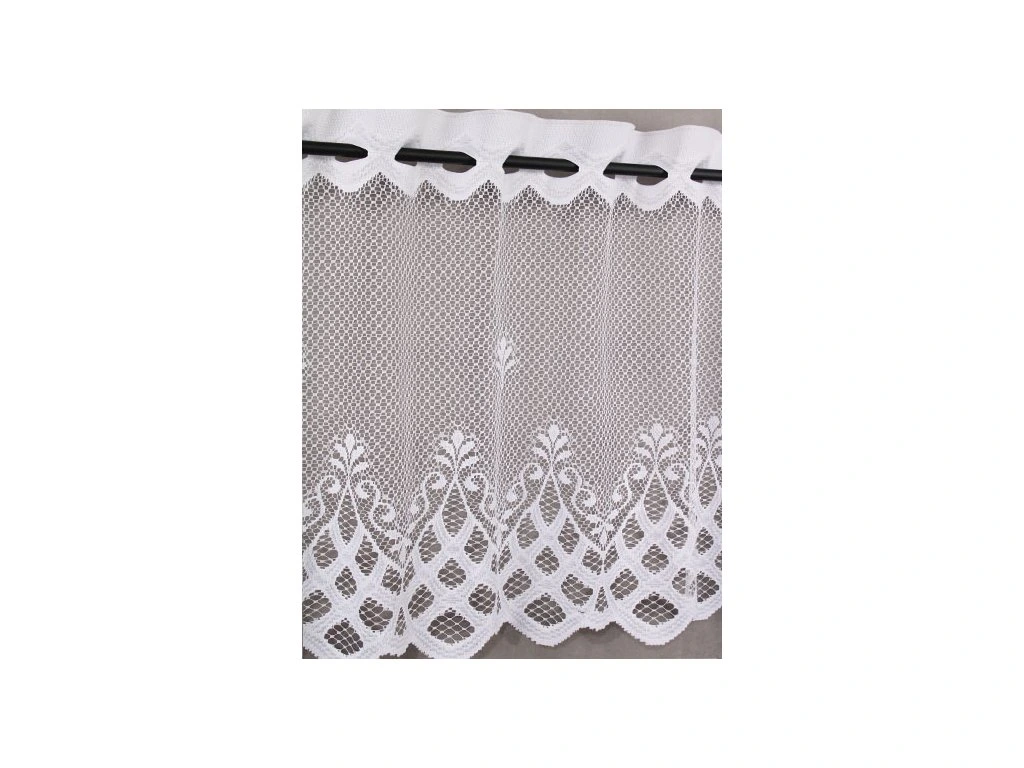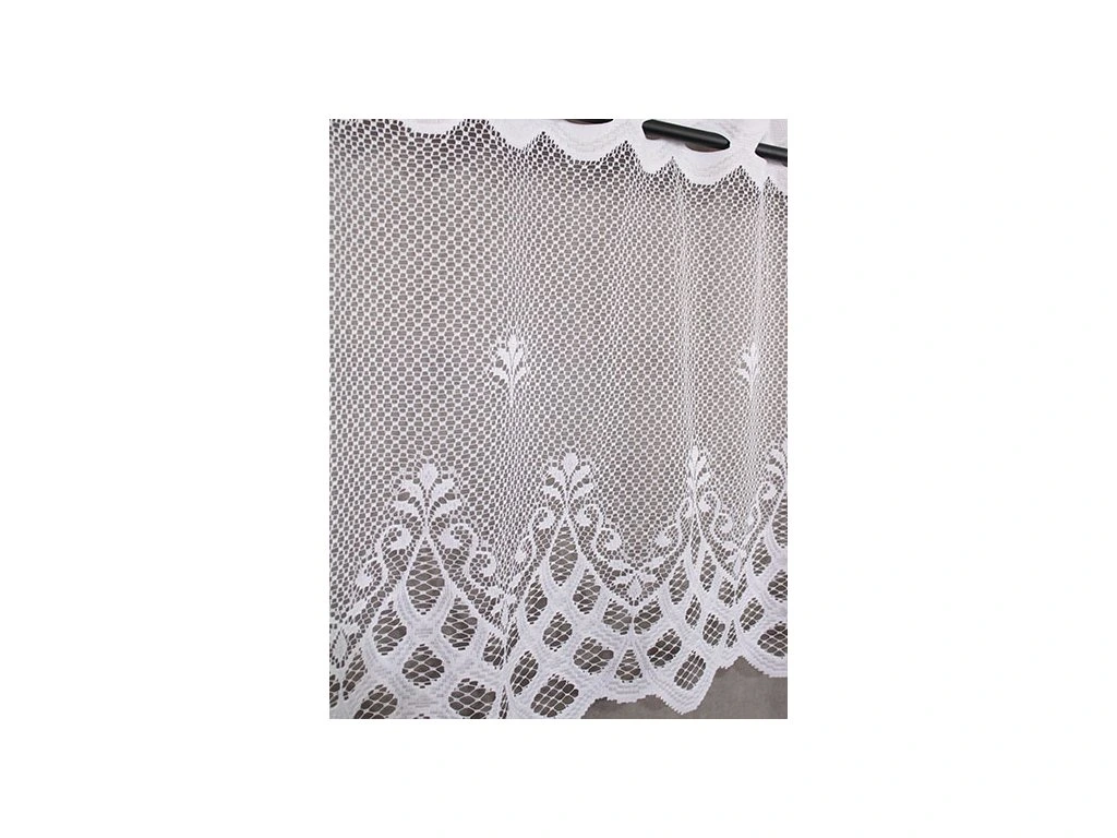 Hrubě pletená žakárová vitrážková záclona s výrazným vzorem a ve spodní části bohatě zdobenou bordurou.